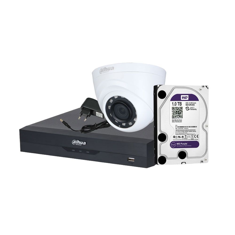 Kit de CCTV compuesto por: 1x grabador DAHUA-2958-FO, 1x disco duro HDD-1TB, 8x minidomos DAHUA-2983 y 8x alimentadores CTD-614N